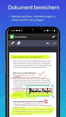 Die intelligente Bildverarbeitung von CamScanner garantiert nicht nur präzise Scans in exzellenter Auflösung, sondern optimiert auch automatisch die Qualität, sodass Texte und Grafiken stets klar und deutlich erscheinen. Verwandeln Sie gescannte Bilder mithilfe fortschrittlicher OCR-Technologie in bearbeitbaren Text, der für weitere Bearbeitung oder das Extrahieren von Informationen bereitsteht. Nutzen Sie die integrierten Bearbeitungswerkzeuge, um Anmerkungen hinzuzufügen, handschriftliche Notizen zu integrieren oder individuelle Wasserzeichen einzufügen. Das Teilen Ihrer digitalisierten Dokumente war noch nie so flexibel: Versenden Sie Dateien im PDF- oder JPEG-Format per E-Mail, über soziale Medien oder als sicheren Link, um Informationen effizient mit Kollegen und Freunden auszutauschen.